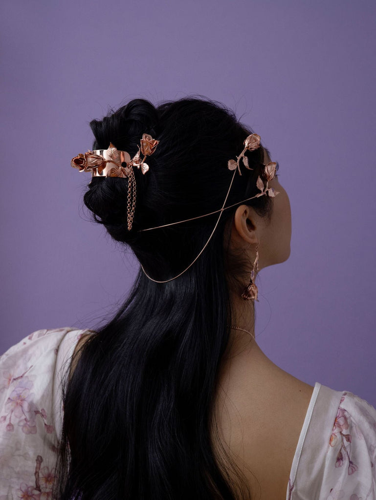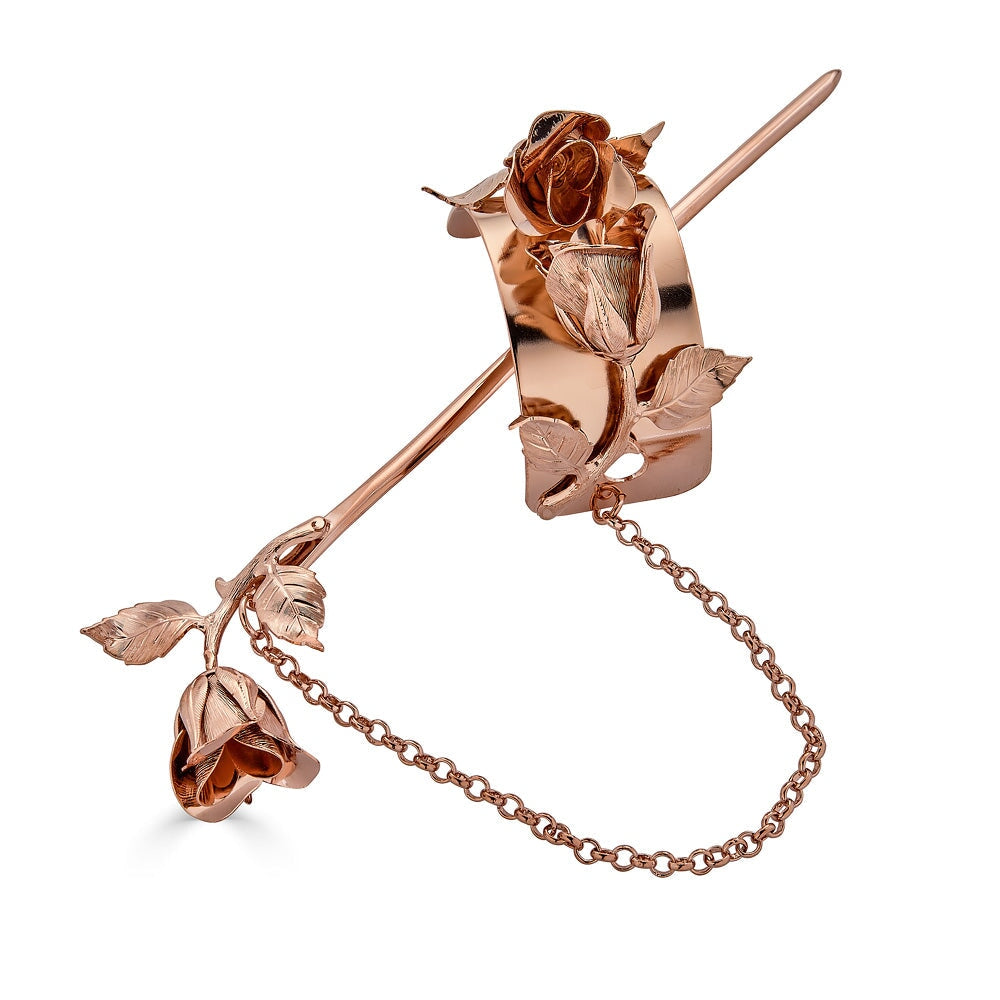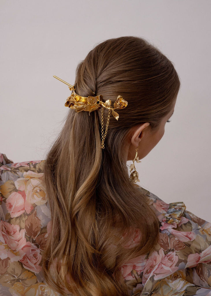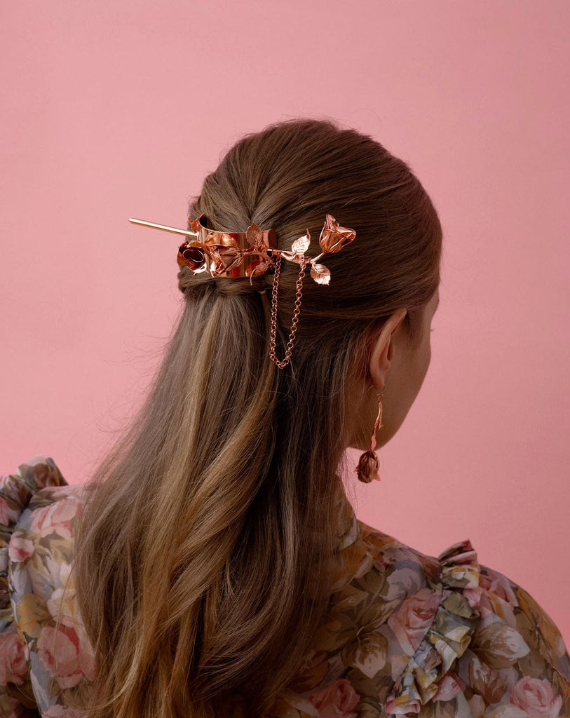 A timeless device is reborn in the Rose and Vine Pony Slide. The chained pin slides into place fitting both your hair, and the rose upon the vine.