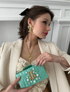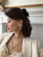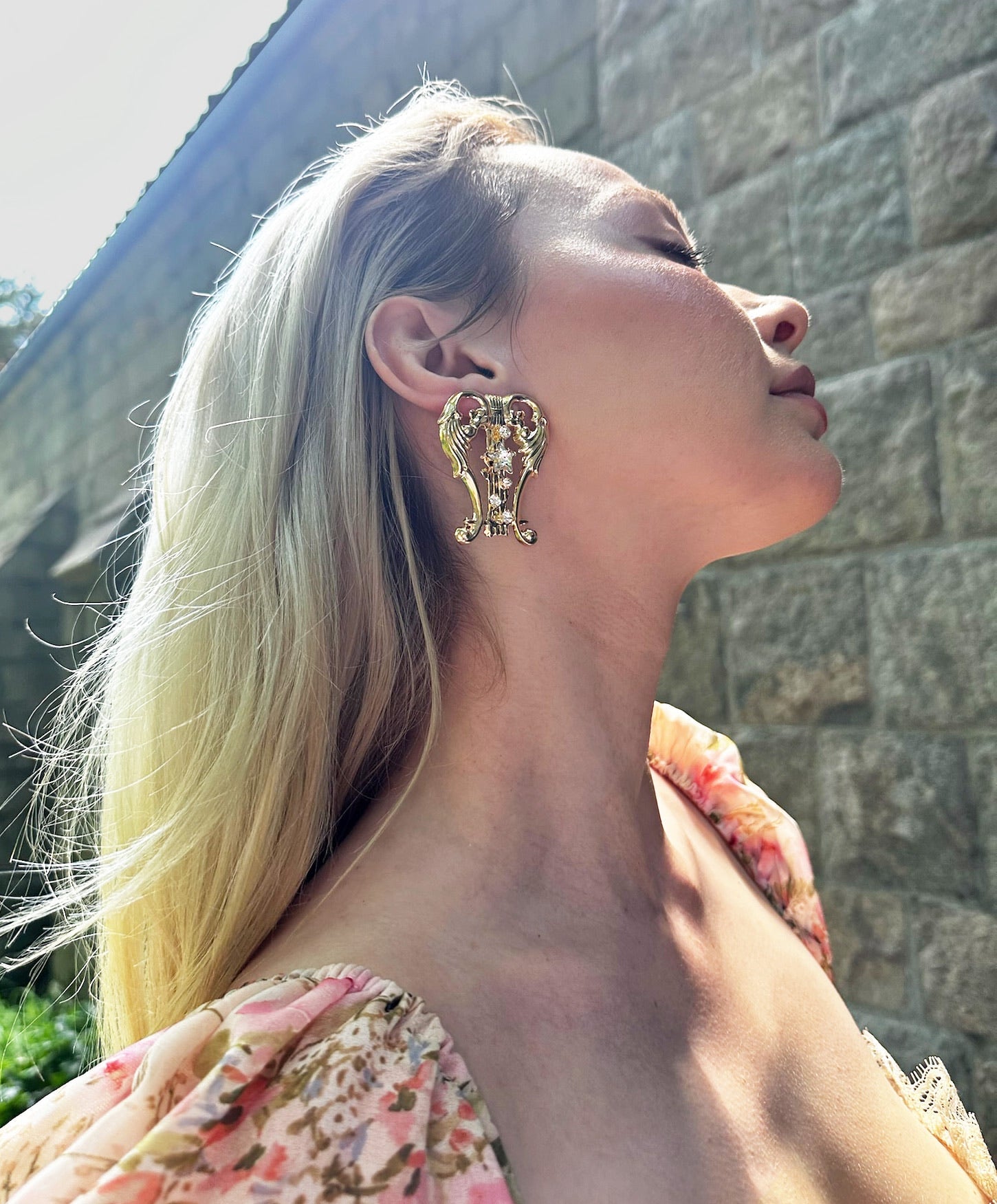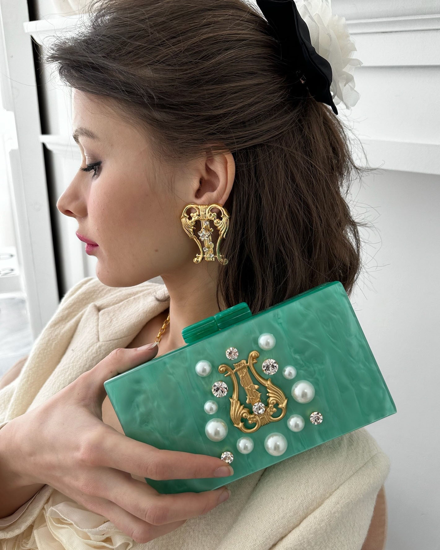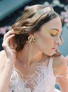 This enticing pair of lyres will transport you to the age of Grecian Myth. Statement Swarovski Crystals of stars dance over 14K gold plated strings linking the ethereal to our realm of reality. Light and easy to wear this earrings are a must have, and pair perfectly with its accompanying clutch.